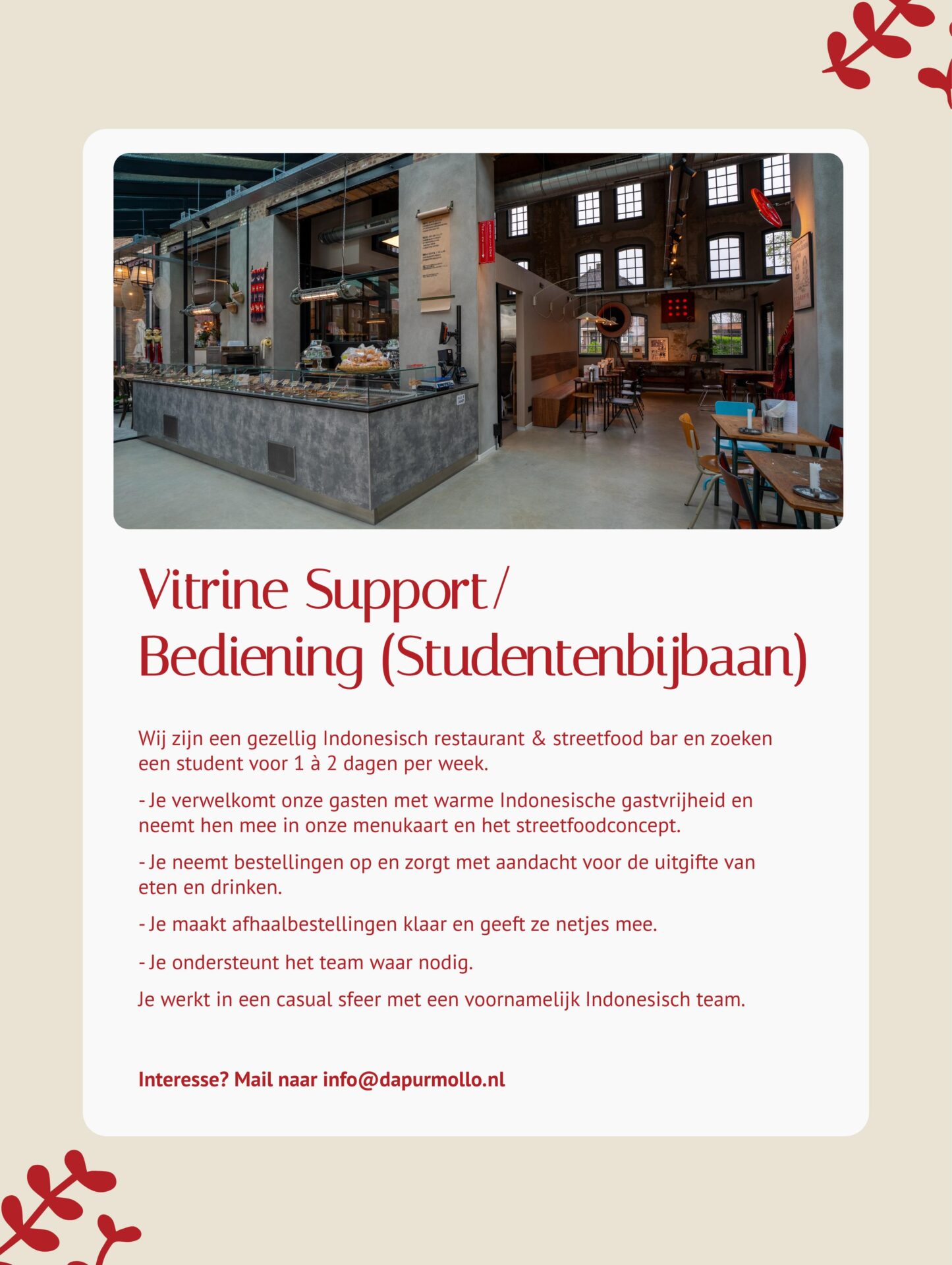 Je verwelkomt onze gasten met warme Indonesische gastvrijheid en neemt hen mee in onze menukaart en het streetfoodconcept